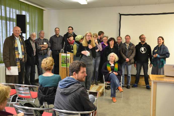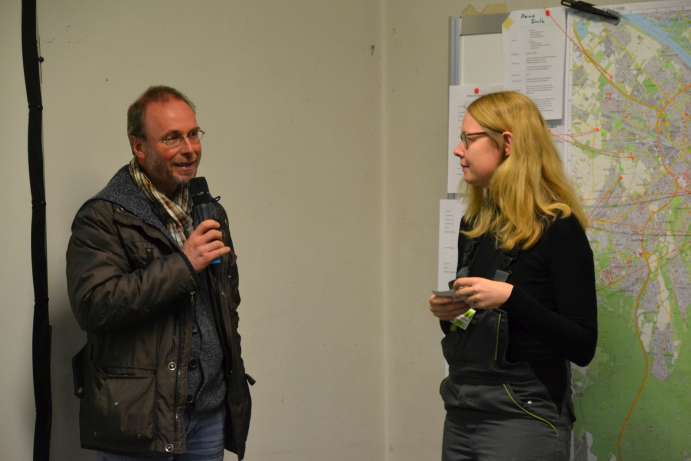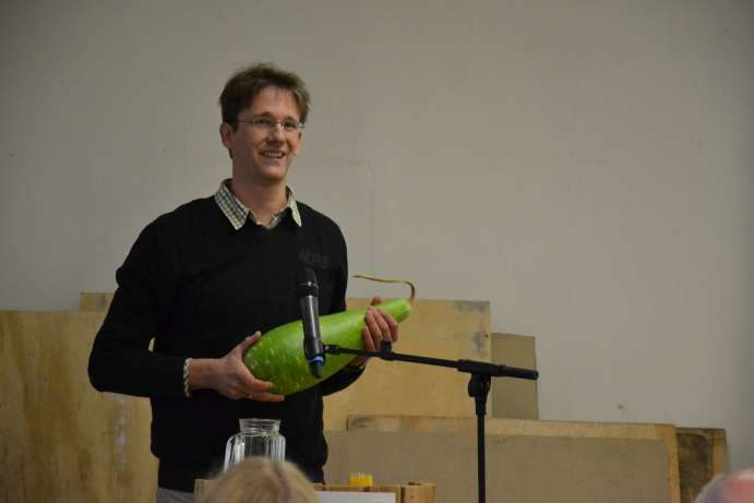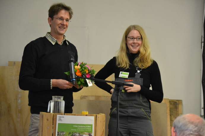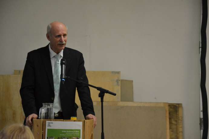 Und über 250 Menschen beteiligen und finanzieren mittlerweile das Projekt Solidarische Landwirtschaft kurz SoLaWi-Bonn und verteilen jede Woche ihre Ernte quer in Bonn, die auf zwei Bio-Höfen extra für sie angebaut wird. Eines der SoLaWi- Depots befindet sich in Haus 8 der Ermekeilkaserne, genau in dem Raum in dem diesmal über hundert Menschen den 1. Bonner Urban Gardening Tag feierten. Die große Resonanz freute die Veranstalter: Ursula Neuman als Vorsitzende der Ermekeilinitiative e.V. und Rüdiger Wagner als Bonner Umweltdezernent begrüßten die vielen Gäste.