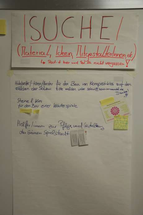 Zum Auftakt des Urban-Gardening Tages gab Hilary Solli, Wissenschaftlerin und Gründerin eines interkulturellen Gartens in Bozen einen Überblick zur Historie und die Praxis des Gemeinschaftsgärtnerns. Praxistipp aus Bozen: Ein kulinarisches Kompostfest sorgt dafür dass dieser Grund-legende Aspekt des Gärtnerns angemessene Beachtung und genügend Unterstützer findet. Anschließend, beim Infomarkt gab es Gelegenheit zum Gespräch und Austausch mit den zahlreichen Vertreter*innen der verschiedenen Projekte. Man konnte einen ersten Blick auf die neuen Flächen der Stadt werfen und sich nach den Rahmenbedingungen für die Übernahme eines Geländes erkundigen. Nach und nach füllte sich auch die Pinnwand mit Gesuchen und Angeboten. Das Mitbringbuffet war reich gedeckt mit Köstlichkeiten aus der ganzen Stadt, das Bonner Saxophonensemble verbreitete einen warmen jazzigen Sound. Auch die Kinder gingen nicht leer aus: Für sie hatte die Stadt einen Stand mit Umweltbildungsangeboten vom Haus der Natur aufgebaut. Ganz ungetrübt war die Freude jedoch nicht: Das Gelände des Kleingartenvereins Bonn-Süd in Kessenich ist bedroht durch ein Bauvorhaben des Aldi-Konzerns, obwohl das Gebiet Teil des Integrierten Freiraumsystems der Stadt Bonn ist.