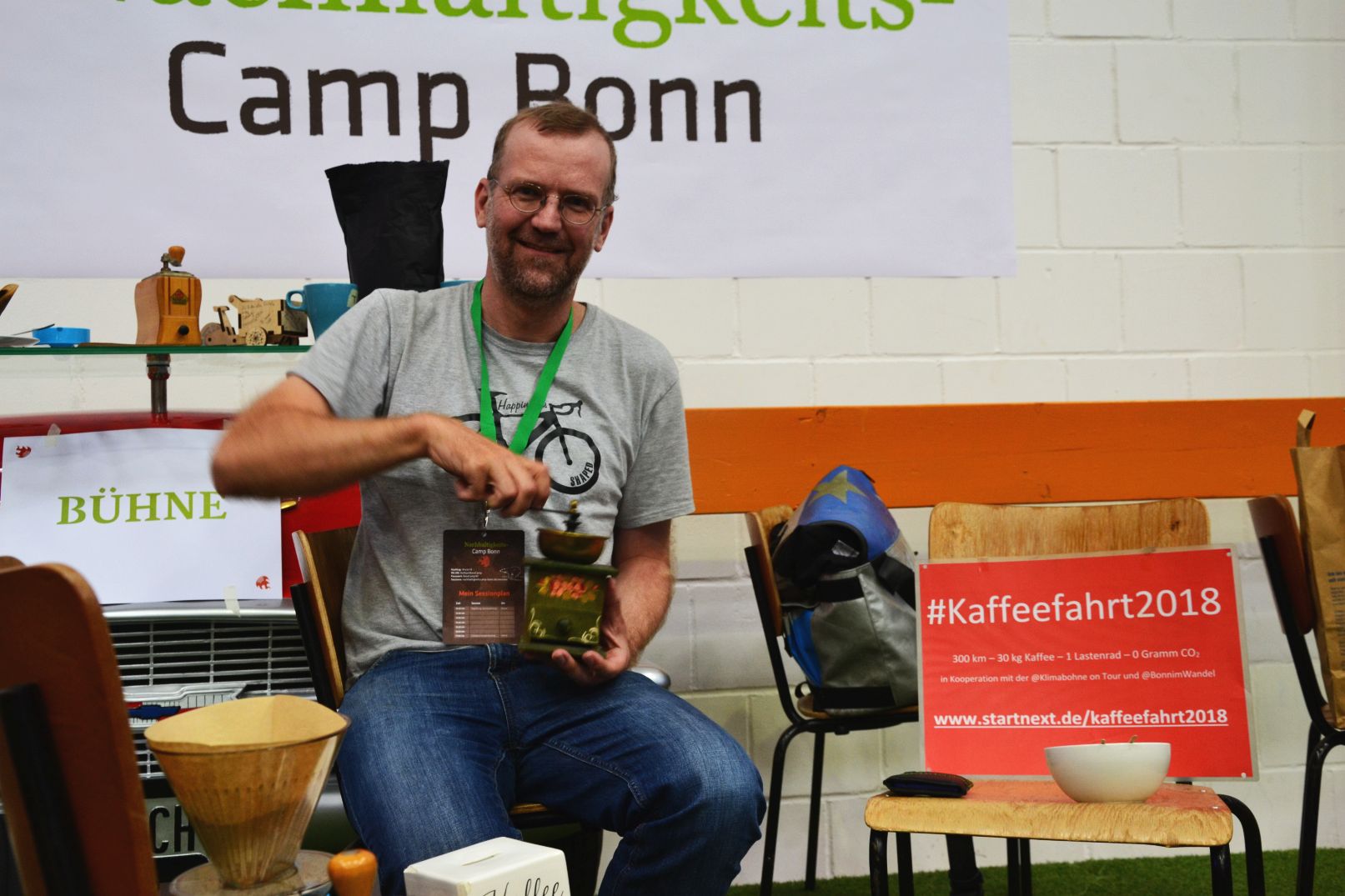 Aug 18: Uli Kindermann mahlt CO2-neutralen Kaffee auf dem Barcamp Bonn für seine Lastenrad Crowdfunding Aktion