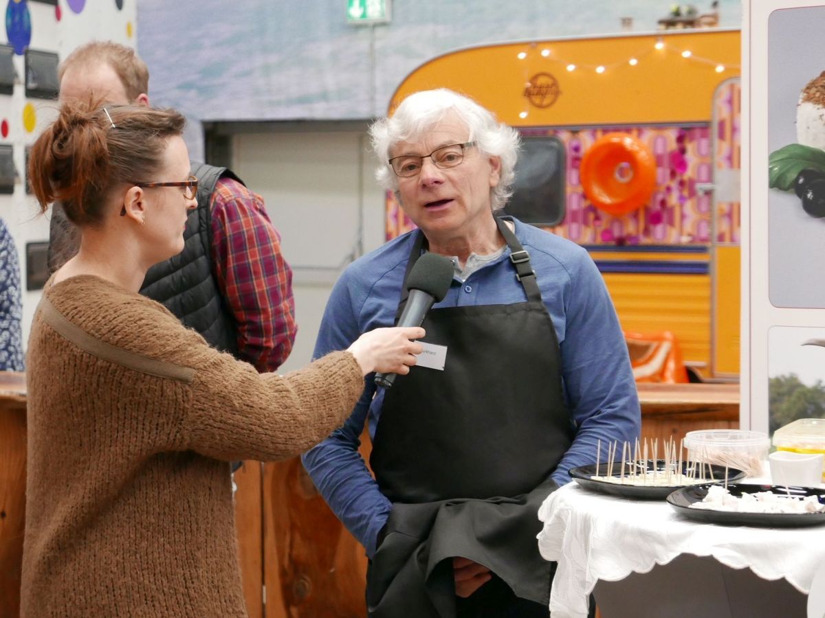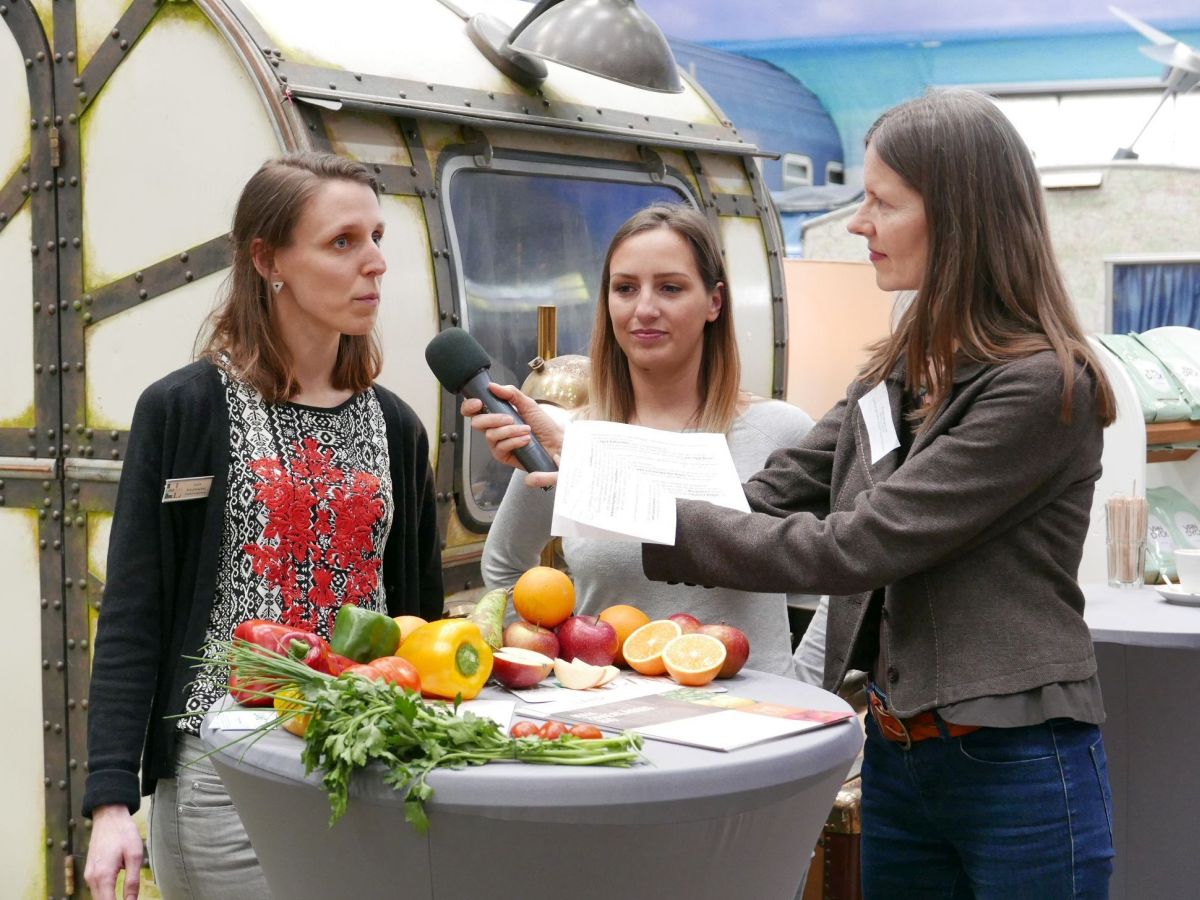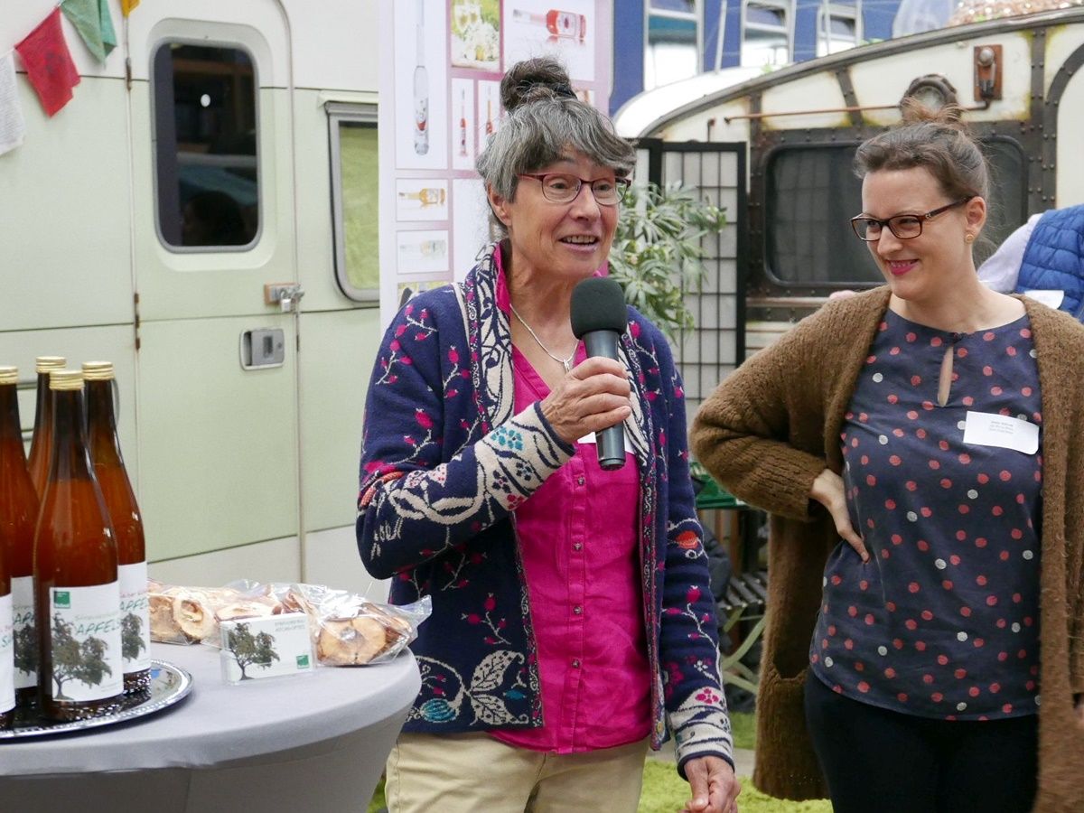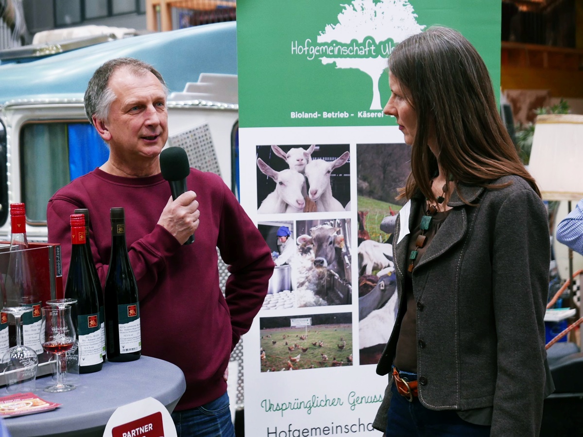 Im Anschluss kamen alle 17 Aussteller in Interviews zu Wort. Sie gaben einen kurzen Einblick zu ihren Beweggründen, sich für Bio zu engagieren und ihre Produkte. Dazu gehörten Erzeuger von Obst und Gemüse, Käsereien, Winzer und Kaffeeröster, aber auch ein Vollsortimenter, der schon viele Jahre Bio-Produkte nach Bonn liefert. Die Interviews führten Jenny Schroth von SlowFood Bonn, Francis Hugenroth, Nachhaltigkeitsberaterin u. a. für die Stadt Bonn und Dorle Gothe, Vorstand der Regionalwert AG Rheinland. Nach dem offiziellen Teil begannen angeregte Gespräche zwischen Erzeugern und Abnehmern. Natürlich durfte auch probiert werden.
