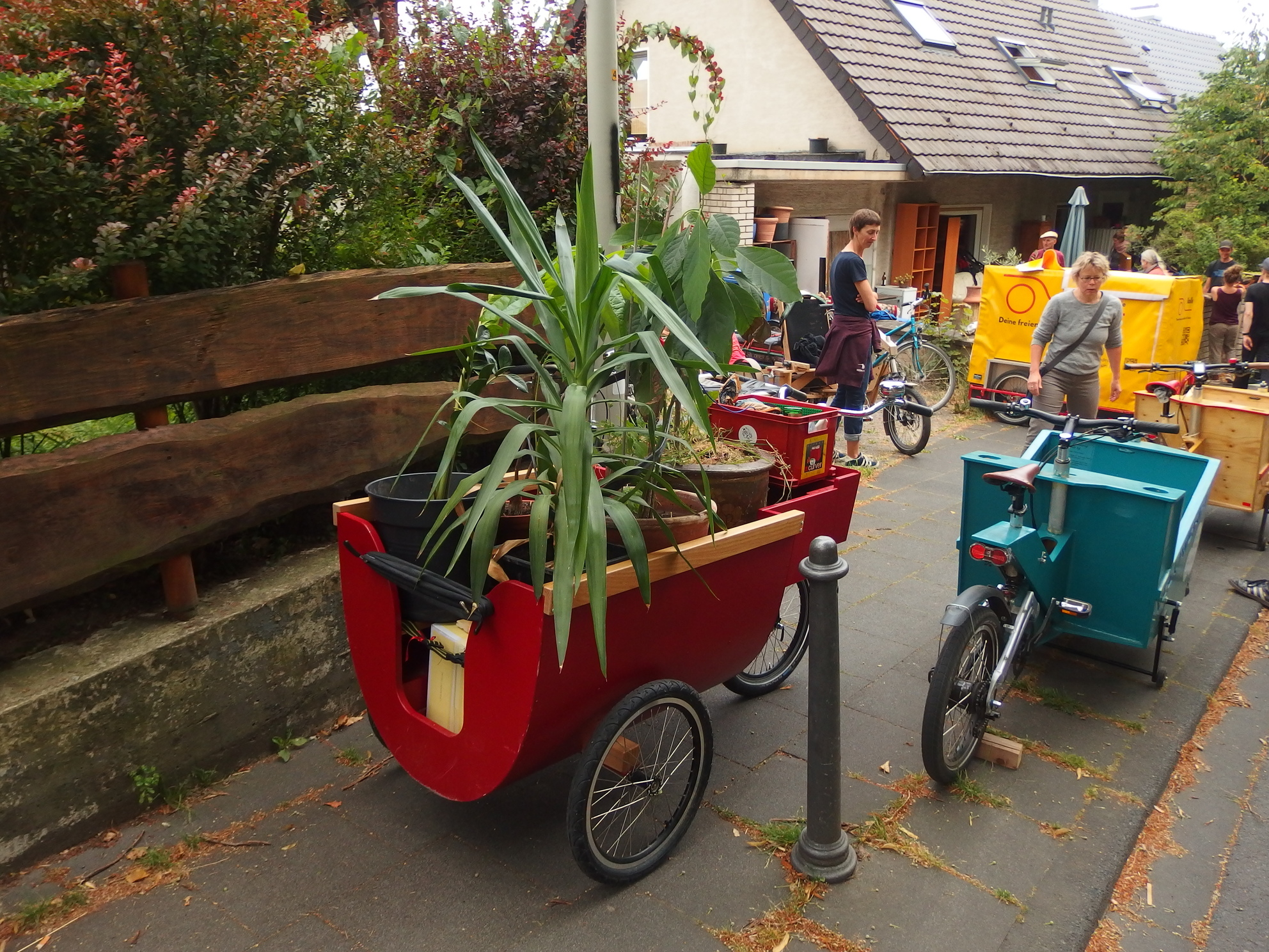 Am Start sind natürlich Räder und Anhänger von den Bonn im Wandel-Lastenradprojekten »Velowerft« und »Bolle Bonn«. Auf das jüngst hinzugekommene elektrifizierte Lastenrad »BOBie« etwa passt locker ein Sofa mit Schrank obendrauf und einiges an Kleinkram unten drunter. Sebastian und Raphael haben sich vorher kurz mit Maurice beraten und zurren nun zufrieden Spanngurte zurecht, damit unterwegs auch nichts verloren geht.
