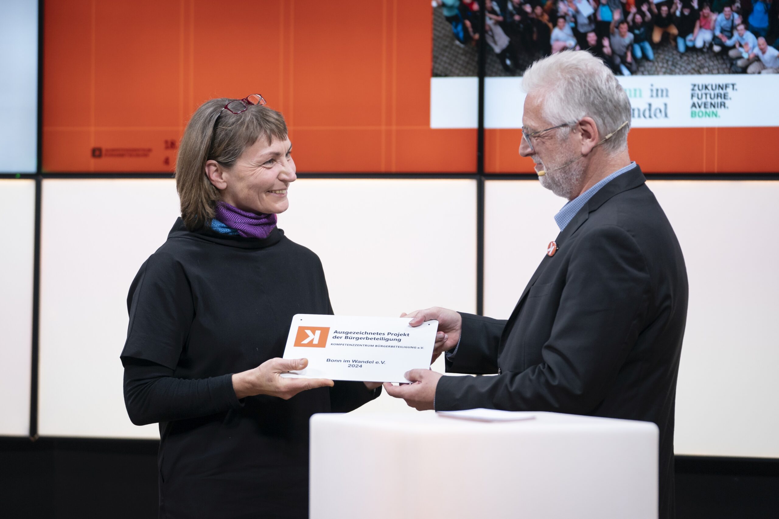 Okt 24: Dr. Andreas Paust vom Kompetenzzentrum Bürgerbeteiligung überreicht Dr. Gesa Maschkowski die Auszeichnung für Bonn4Future. Foto: Tannea Sommer