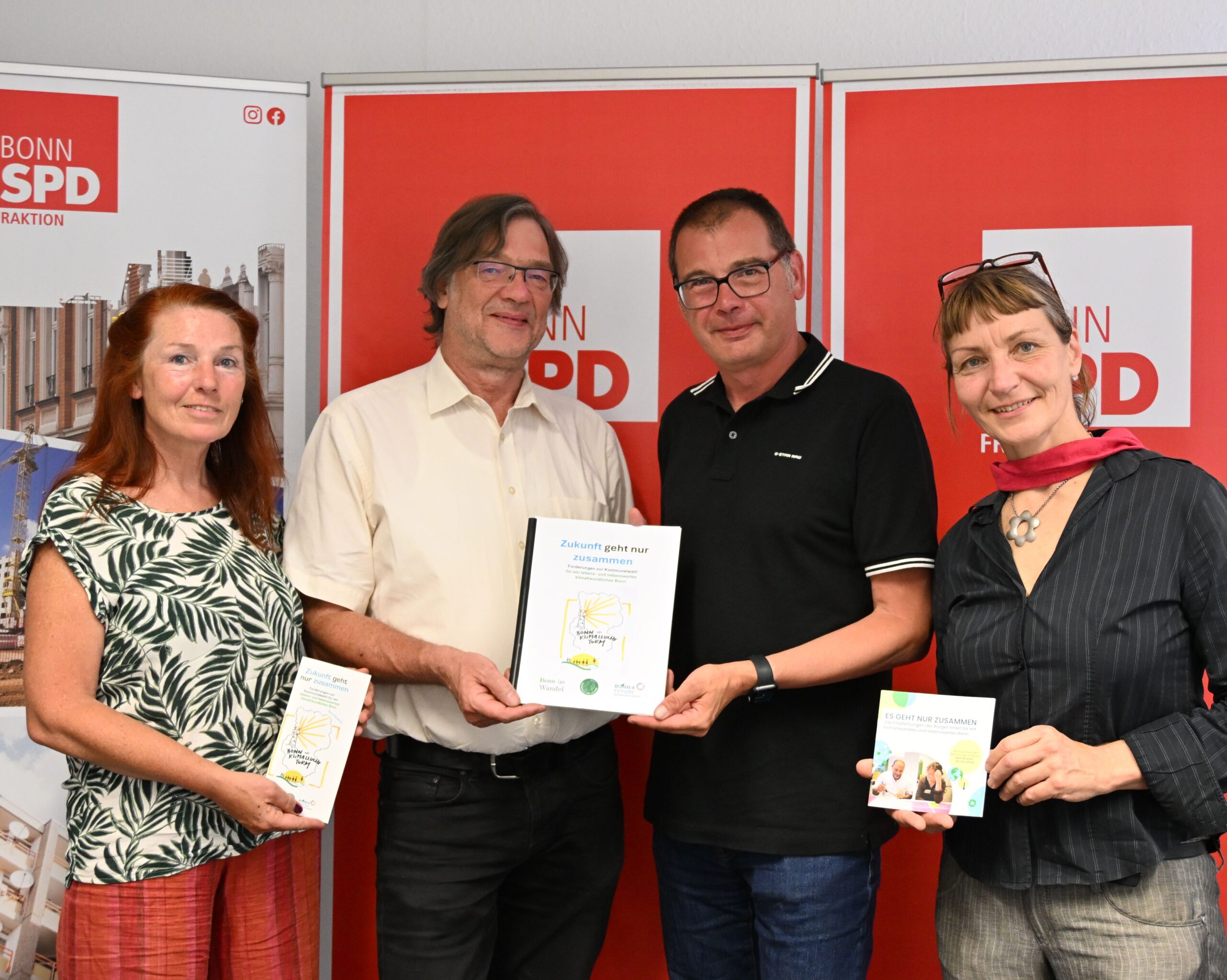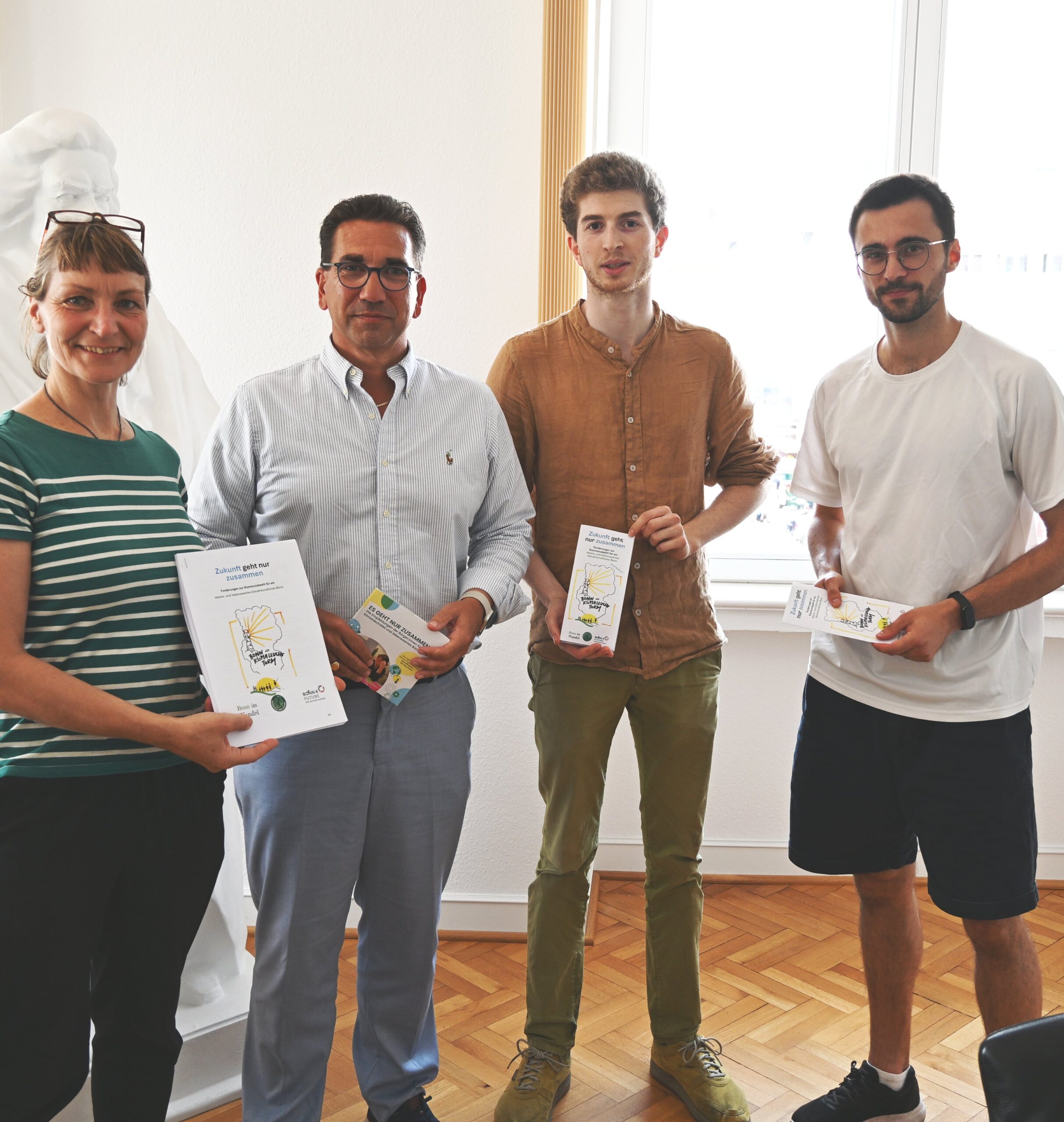 Nach einem Austausch über die Bonner Klimapolitik übergeben Raphael Räpple und Dr. Gesa Maschkowski das Zukunftsprogramm an Dr. Michael Faber und Julia Schenkel (Die Linke)