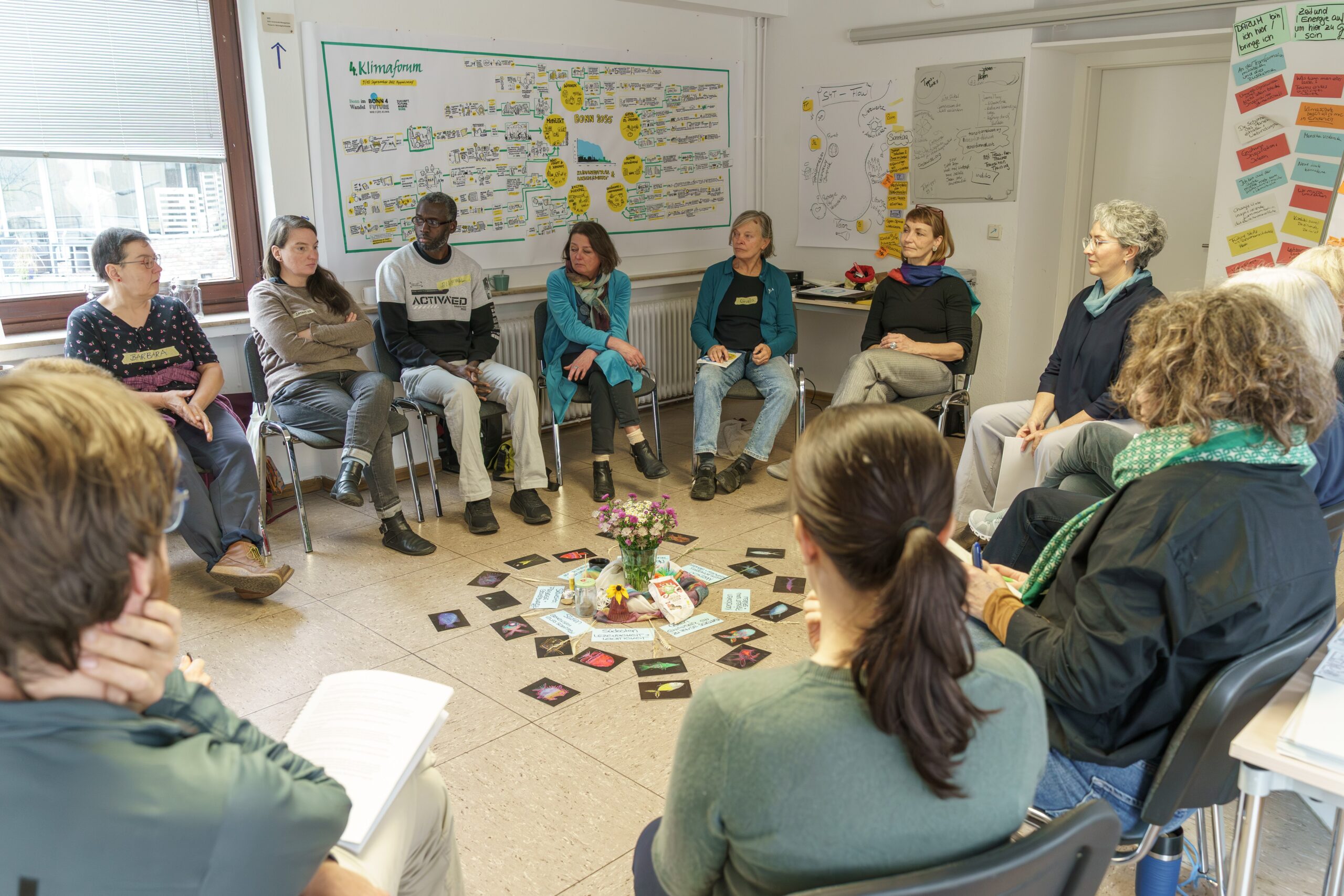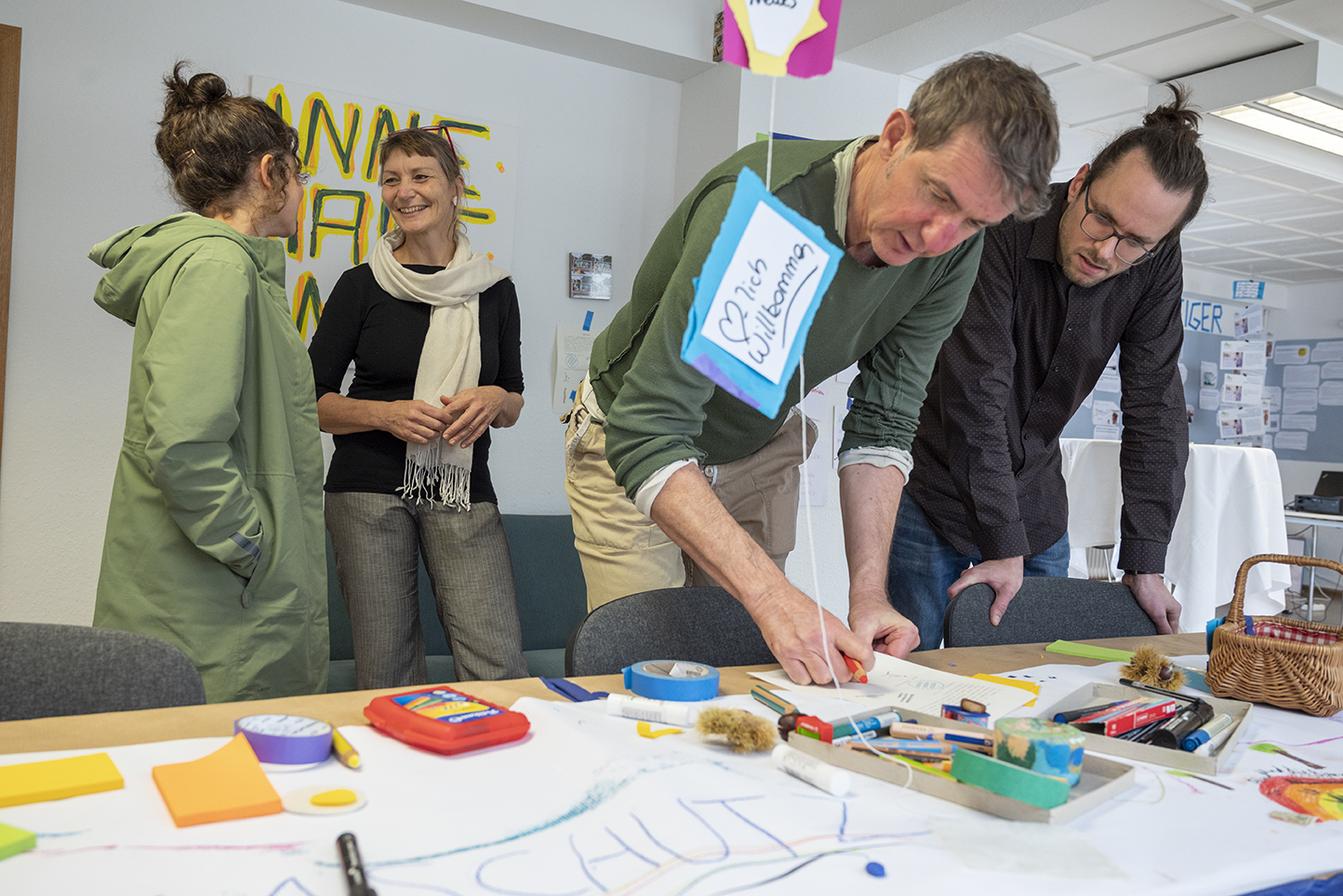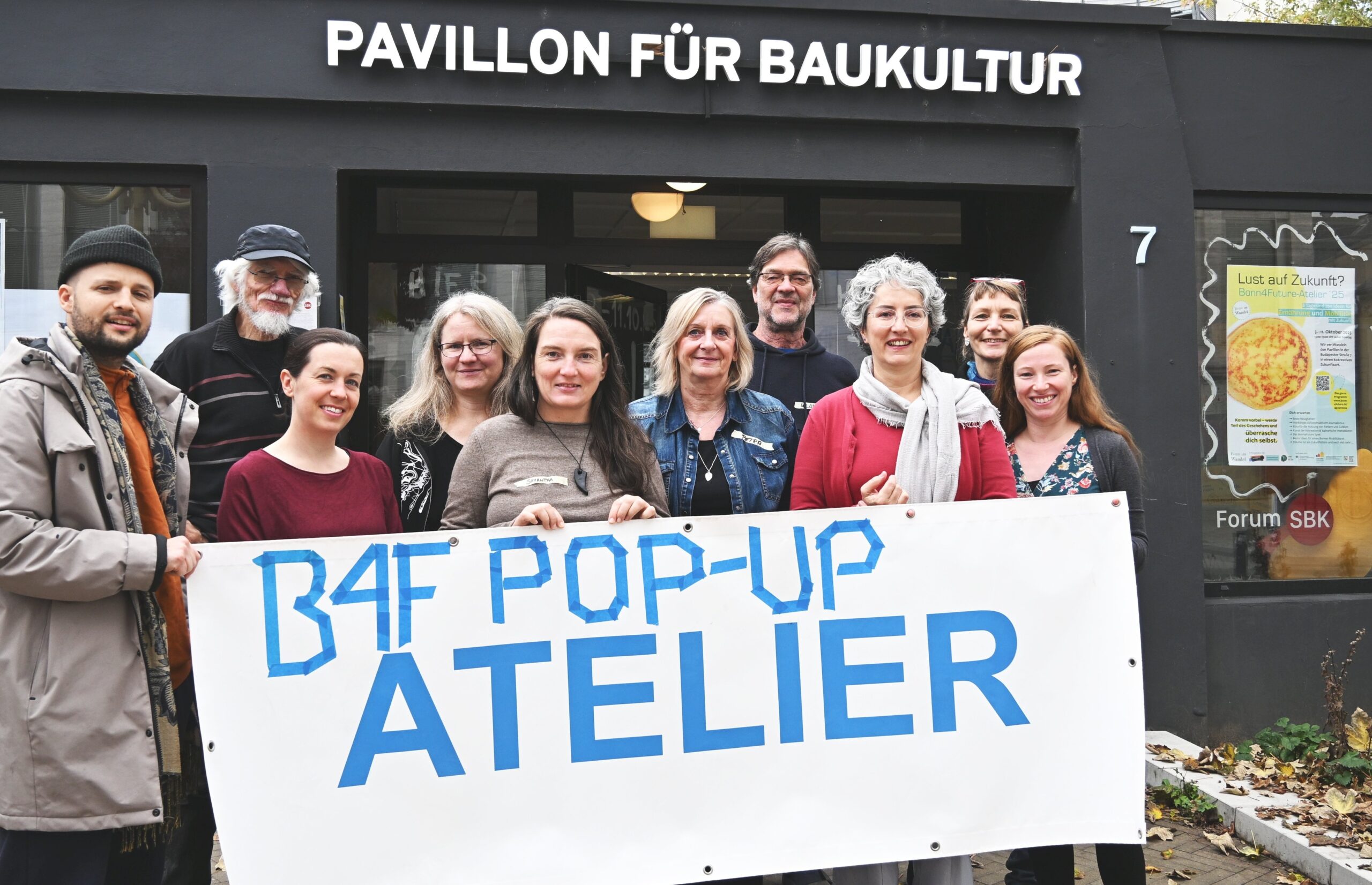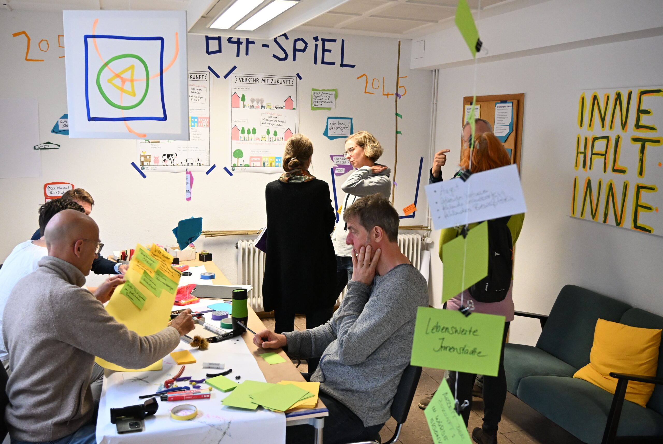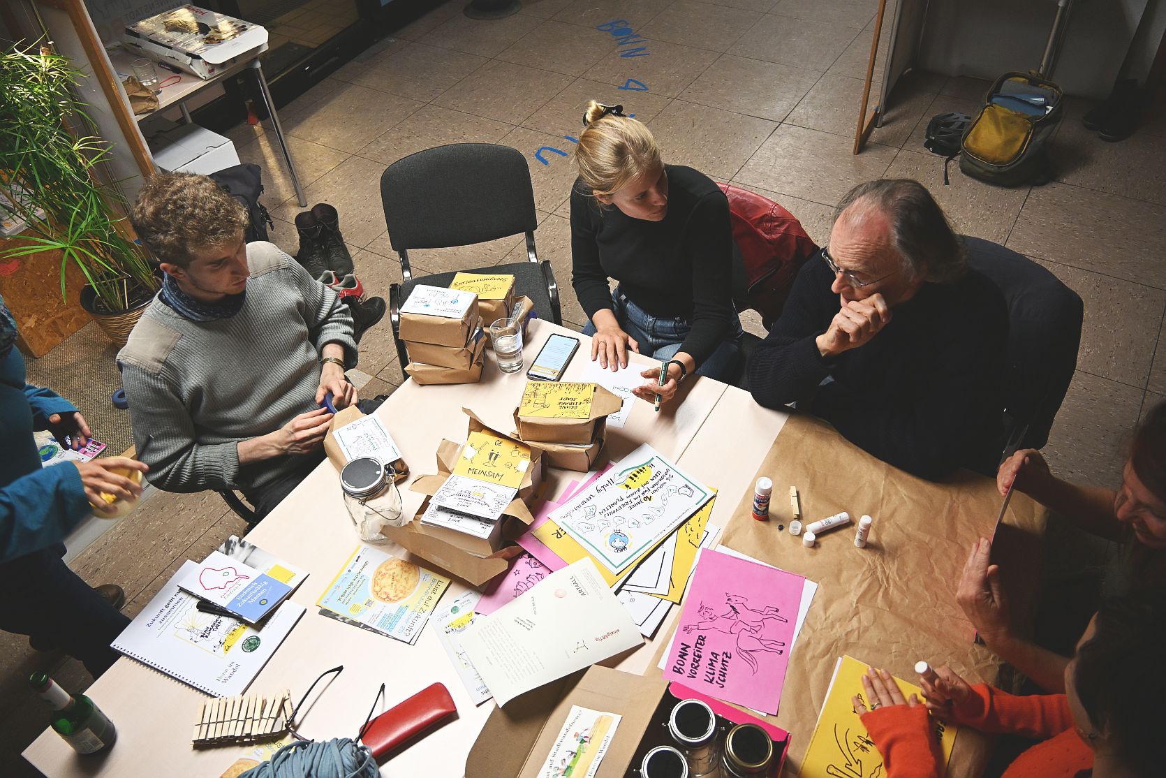 Besucher:innen des B4F PopUpAtelier vor dem Workshop „Spielend das System verändern“ mit Susanne Willner. Foto: ein Passant