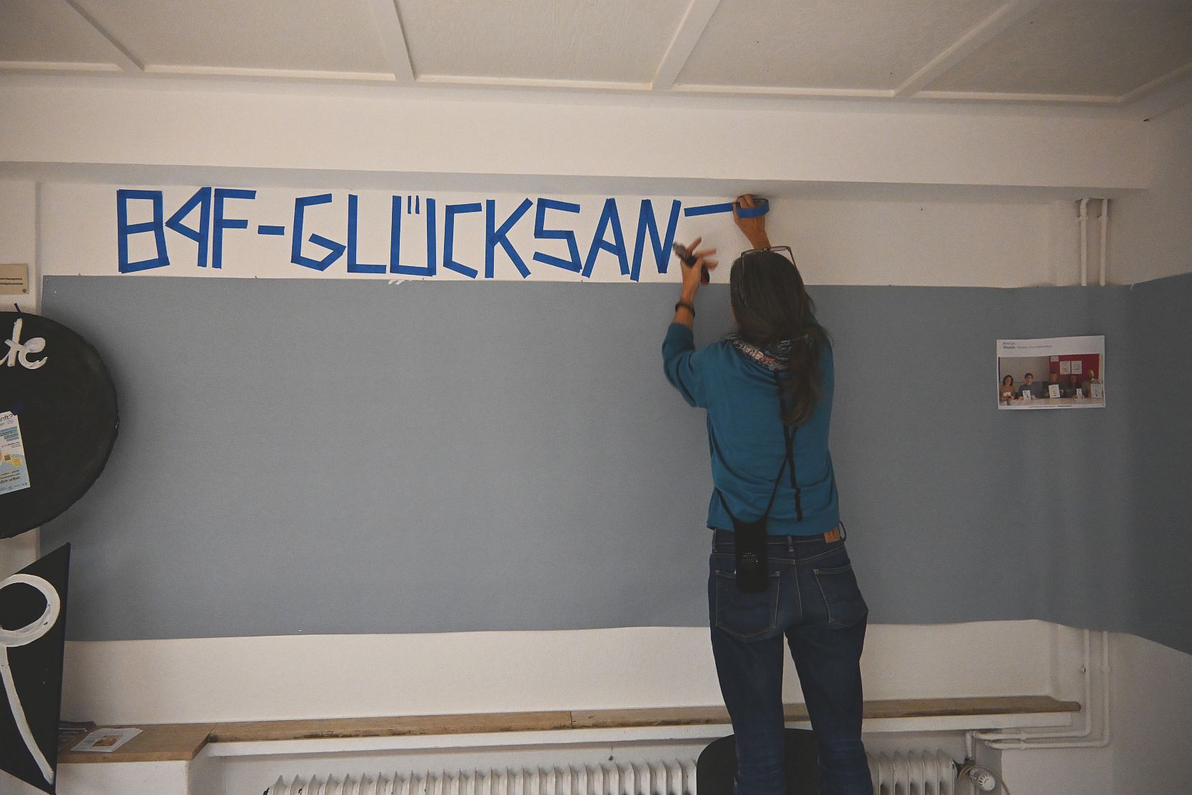 Daniela Baum klebt den Schriftzug B4F Glücksanzeiger auf die Wand