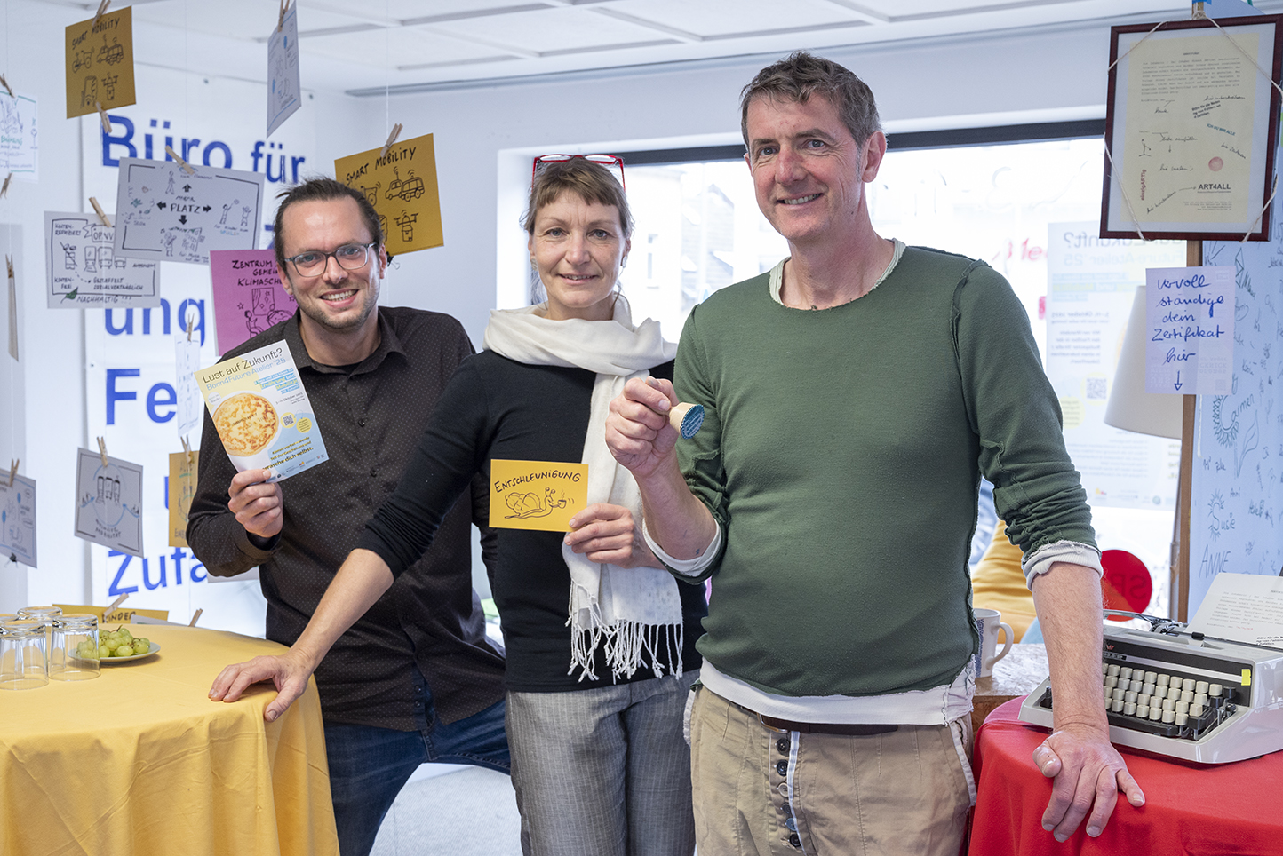 David Schwarz vom Innenstadt Management, Gesa Maschkowski, Bonn im Wandel und Daniel Walbrodt freuen sich über das PopUPAtelier im Zeichen des Pfannekuchens. Foto: Jo Hempel