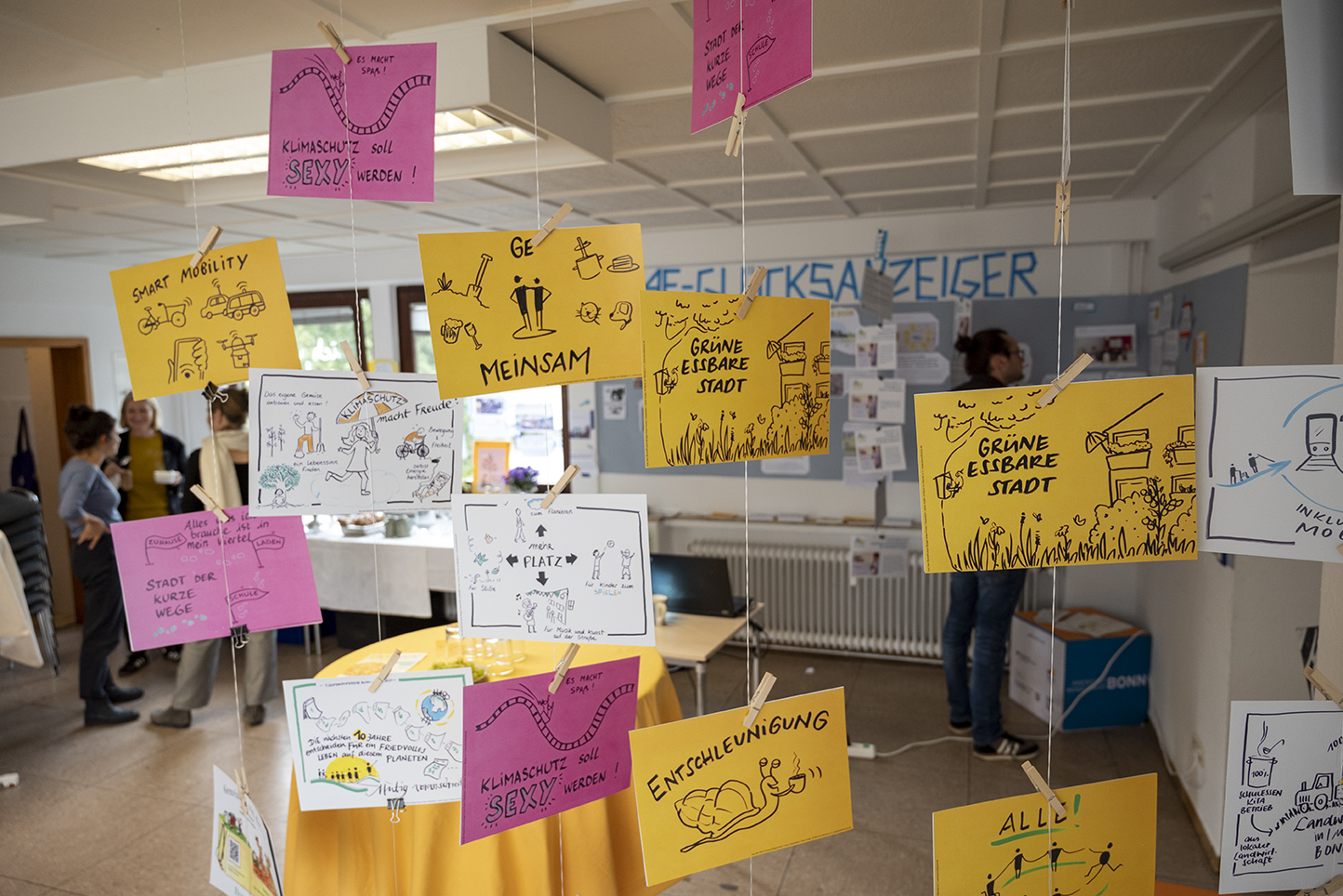 Berichte aus dem B4F-Glücksanzeiger, davor hängen die Empfehlungen der Bürger:innen aus Bonn4Future. Foto: Jo Hempel